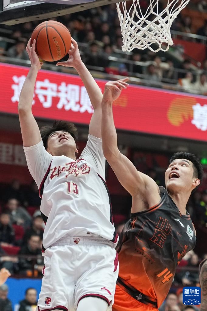 3月16日,浙江稠州金租队球员张洪硕(左)在比赛中上篮。新华社记者 朱峥 摄