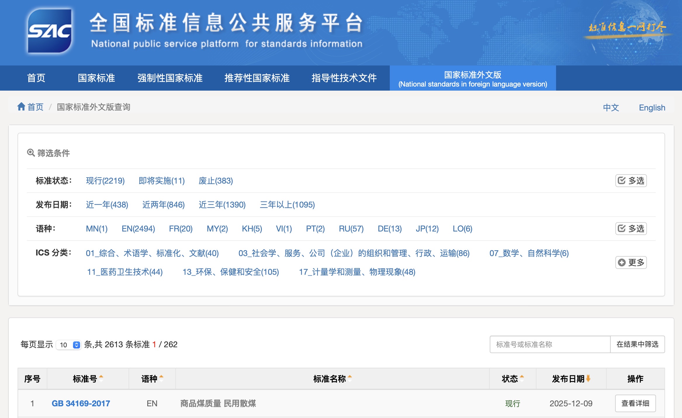 一是提供了全面、权威、多语种的国家标准外文版文本。系统集中公开了由市场监管总局发布的国家标准外文版共2613项。这些外文版将用于中文国家标准的国际化使用和推广,是国际社会获取中国标准的权威和便捷渠道。